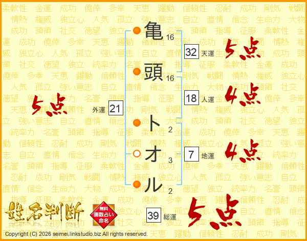 亀頭トオルさんの総運は39画の5点!