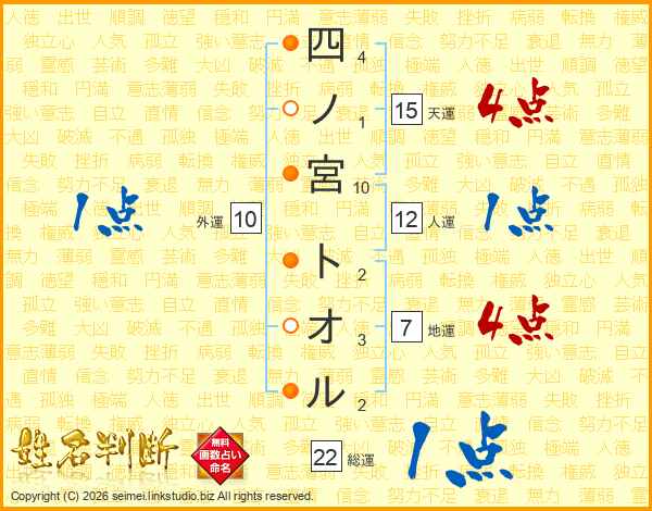 四ノ宮トオルさんの総運は22画の1点!