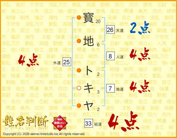 生活面を象徴する運勢です。外部から受ける影響力を表し、結婚運、家庭運や職場、環境への順応性を表します。総運から人運を引いた画数。姓や名が1文字の場合を除く。