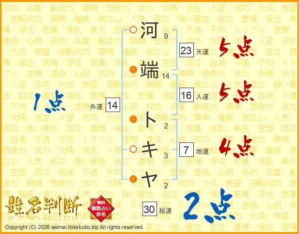 生活面を象徴する運勢です。外部から受ける影響力を表し、結婚運、家庭運や職場、環境への順応性を表します。総運から人運を引いた画数。姓や名が1文字の場合を除く。