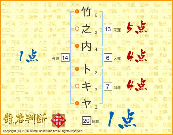 竹(6画)之(3画)内(4画) ト(2画)キ(3画)ヤ(2画)