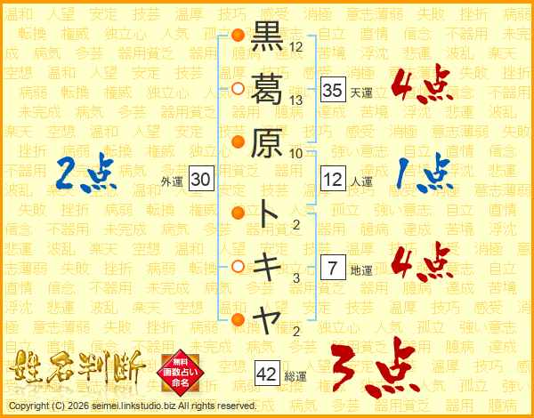 黒(12画)葛(13画)原(10画) ト(2画)キ(3画)ヤ(2画)