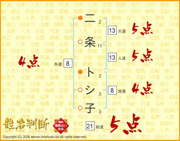 あなたの人生を表す1番重要な運勢です。生涯を通じて影響する総合運となり、主に50歳以降の晩年期に影響を及ぼします。苗字と名前の合計画数。