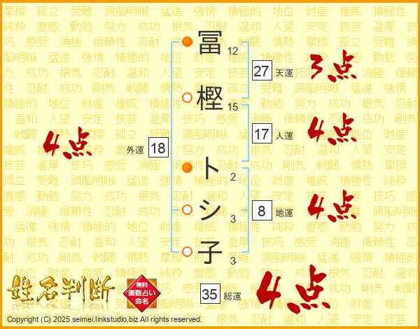 冨(12画)樫(15画) ト(2画)シ(3画)子(3画)