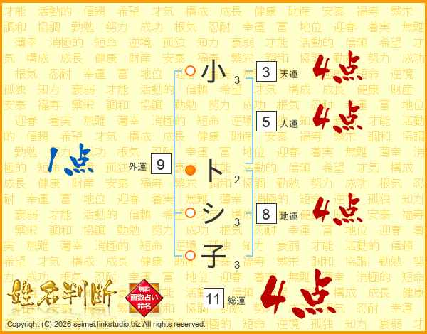 生活面を象徴する運勢です。外部から受ける影響力を表し、結婚運、家庭運や職場、環境への順応性を表します。総運から人運を引いた画数。姓や名が1文字の場合を除く。