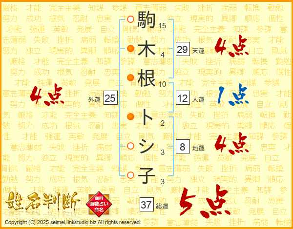 駒(15画)木(4画)根(10画) ト(2画)シ(3画)子(3画)