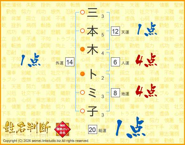 三(3画)本(5画)木(4画) ト(2画)ミ(3画)子(3画)