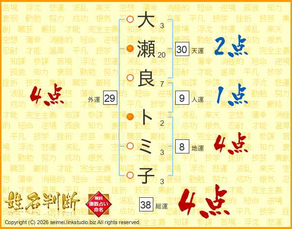 大(3画)瀬(20画)良(7画) ト(2画)ミ(3画)子(3画)