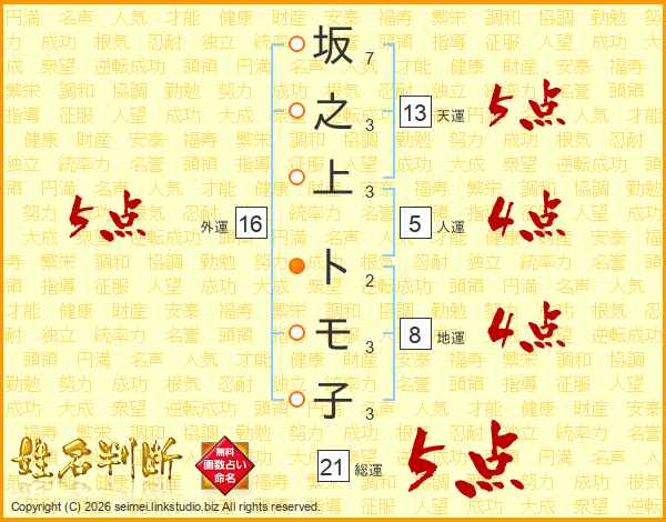 坂(7画)之(3画)上(3画) ト(2画)モ(3画)子(3画)