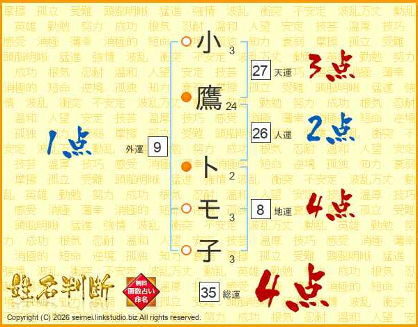 小(3画)鷹(24画) ト(2画)モ(3画)子(3画)