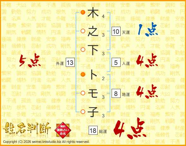木(4画)之(3画)下(3画) ト(2画)モ(3画)子(3画)