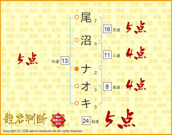 尾沼ナオキさんの外運は13画の5点!