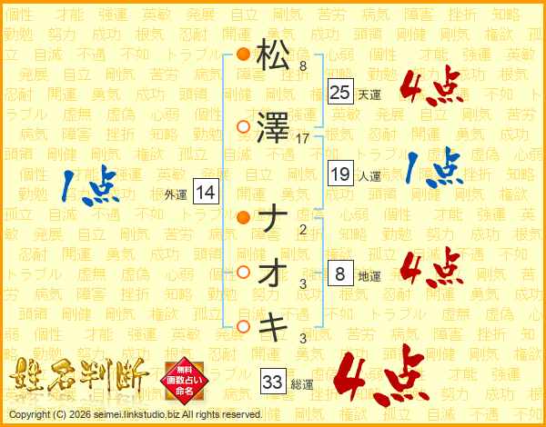 松澤ナオキさんの総運は33画の4点!