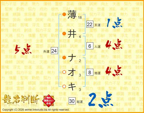 薄(18画)井(4画) ナ(2画)オ(3画)キ(3画)