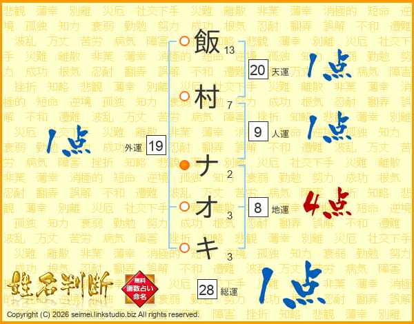 飯(13画)村(7画) ナ(2画)オ(3画)キ(3画)
