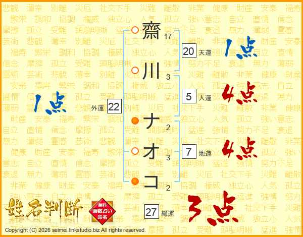 齋(17画)川(3画) ナ(2画)オ(3画)コ(2画)
