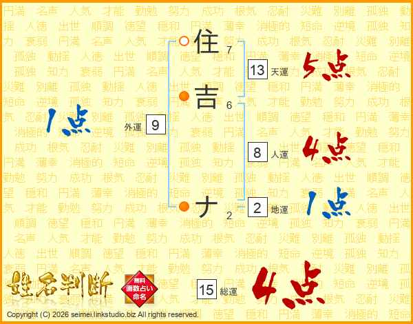 生活面を象徴する運勢です。外部から受ける影響力を表し、結婚運、家庭運や職場、環境への順応性を表します。総運から人運を引いた画数。姓や名が1文字の場合を除く。