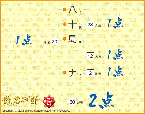 生活面を象徴する運勢です。外部から受ける影響力を表し、結婚運、家庭運や職場、環境への順応性を表します。総運から人運を引いた画数。姓や名が1文字の場合を除く。