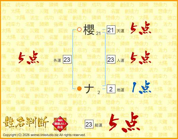 生活面を象徴する運勢です。外部から受ける影響力を表し、結婚運、家庭運や職場、環境への順応性を表します。総運から人運を引いた画数。姓や名が1文字の場合を除く。