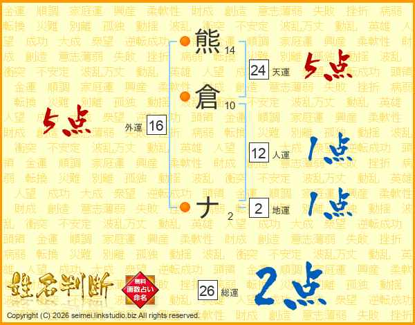 生活面を象徴する運勢です。外部から受ける影響力を表し、結婚運、家庭運や職場、環境への順応性を表します。総運から人運を引いた画数。姓や名が1文字の場合を除く。
