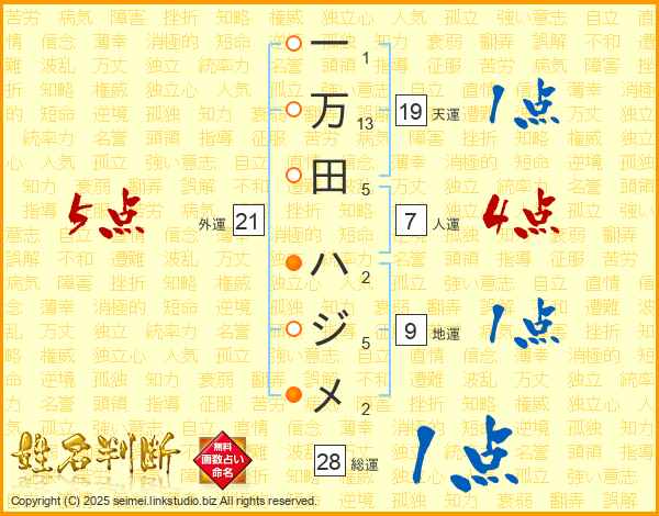 一(1画)万(13画)田(5画) ハ(2画)ジ(5画)メ(2画)