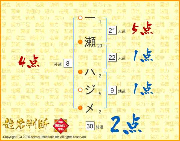 一(1画)瀬(20画) ハ(2画)ジ(5画)メ(2画)