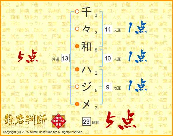 千(3画)々(3画)和(8画) ハ(2画)ジ(5画)メ(2画)