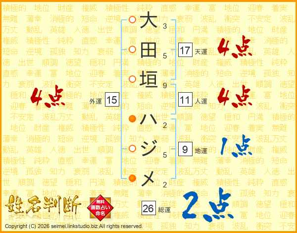 大(3画)田(5画)垣(9画) ハ(2画)ジ(5画)メ(2画)