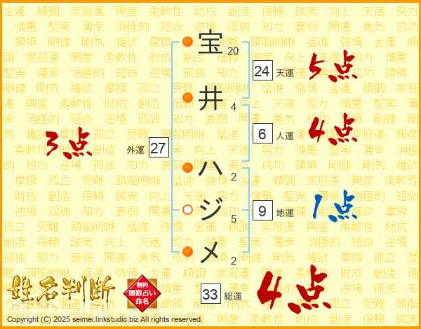宝(20画)井(4画) ハ(2画)ジ(5画)メ(2画)