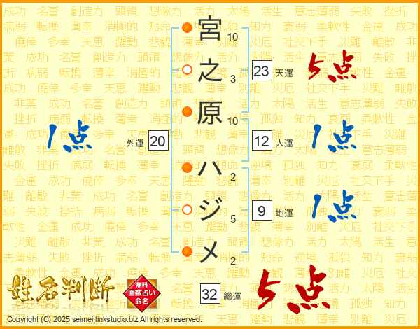 宮(10画)之(3画)原(10画) ハ(2画)ジ(5画)メ(2画)