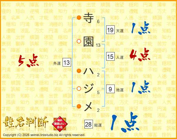寺(6画)園(13画) ハ(2画)ジ(5画)メ(2画)