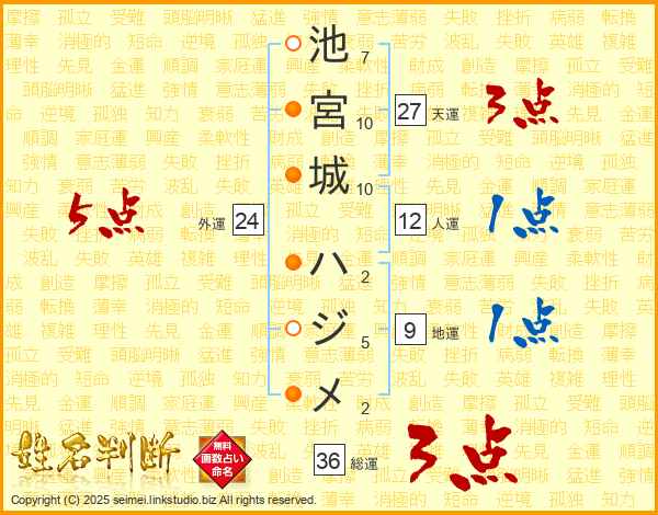 池(7画)宮(10画)城(10画) ハ(2画)ジ(5画)メ(2画)