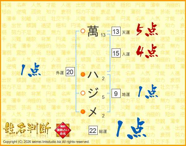 萬(13画) ハ(2画)ジ(5画)メ(2画)