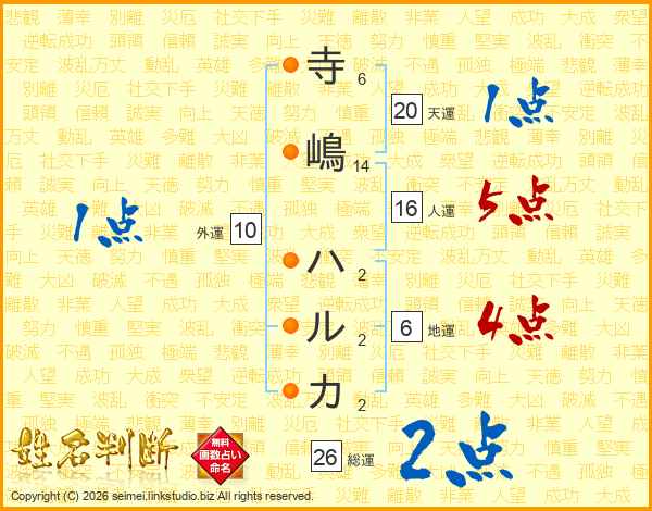 寺(6画)嶋(14画) ハ(2画)ル(2画)カ(2画)