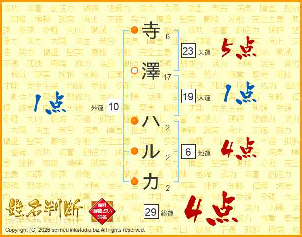 寺(6画)澤(17画) ハ(2画)ル(2画)カ(2画)