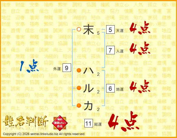 末(5画) ハ(2画)ル(2画)カ(2画)