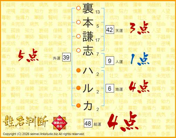 裏本謙志ハルカさんの外運は39画の5点!