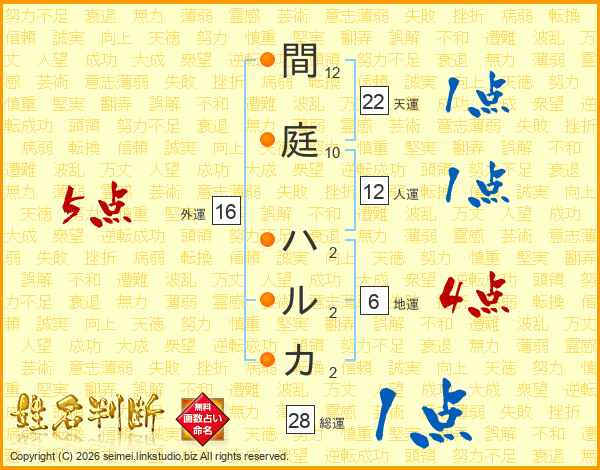 生活面を象徴する運勢です。外部から受ける影響力を表し、結婚運、家庭運や職場、環境への順応性を表します。総運から人運を引いた画数。姓や名が1文字の場合を除く。