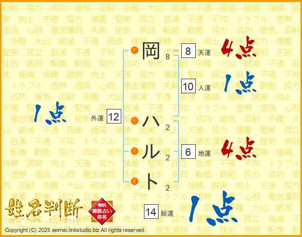 岡(8画) ハ(2画)ル(2画)ト(2画)