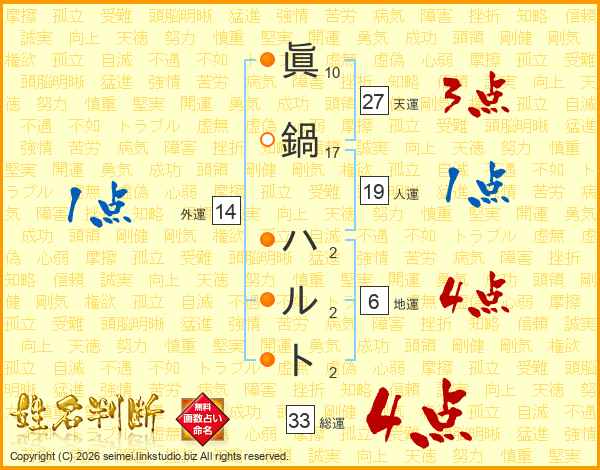 眞鍋ハルトさんの総運は33画の4点!