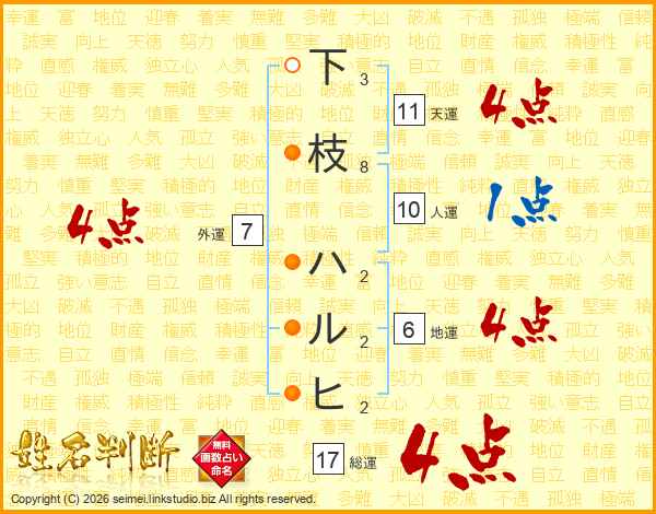 下(3画)枝(8画) ハ(2画)ル(2画)ヒ(2画)