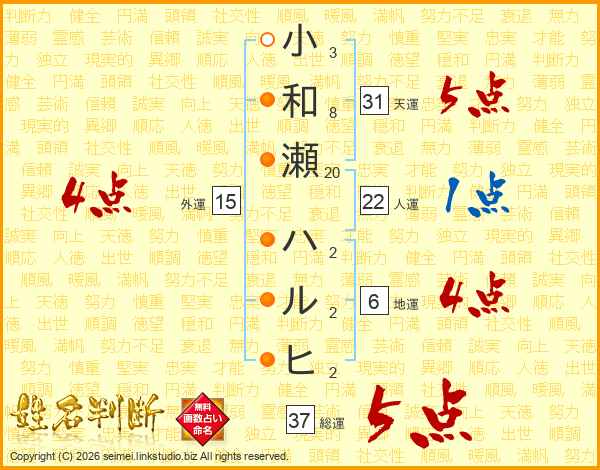 小(3画)和(8画)瀬(20画) ハ(2画)ル(2画)ヒ(2画)