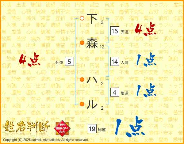 生活面を象徴する運勢です。外部から受ける影響力を表し、結婚運、家庭運や職場、環境への順応性を表します。総運から人運を引いた画数。姓や名が1文字の場合を除く。