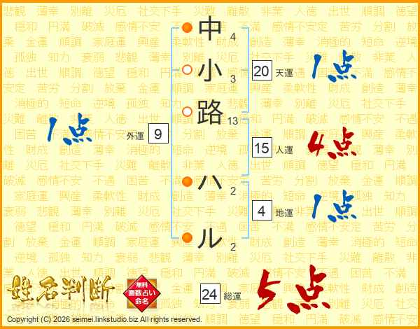 生活面を象徴する運勢です。外部から受ける影響力を表し、結婚運、家庭運や職場、環境への順応性を表します。総運から人運を引いた画数。姓や名が1文字の場合を除く。