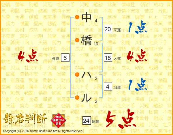 あなたの人生を表す1番重要な運勢です。生涯を通じて影響する総合運となり、主に50歳以降の晩年期に影響を及ぼします。苗字と名前の合計画数。