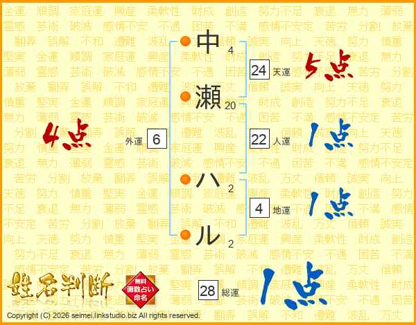 中瀬ハルさんの総運は28画の1点!