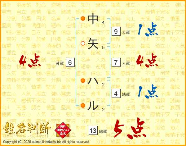 中矢ハルさんの総運は13画の5点!