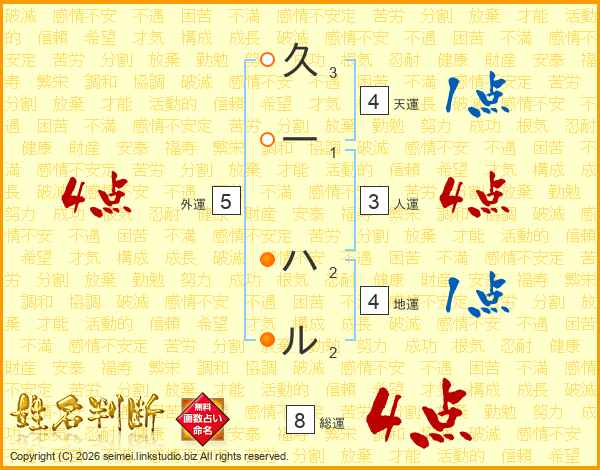 生活面を象徴する運勢です。外部から受ける影響力を表し、結婚運、家庭運や職場、環境への順応性を表します。総運から人運を引いた画数。姓や名が1文字の場合を除く。