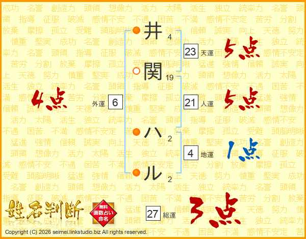 生活面を象徴する運勢です。外部から受ける影響力を表し、結婚運、家庭運や職場、環境への順応性を表します。総運から人運を引いた画数。姓や名が1文字の場合を除く。