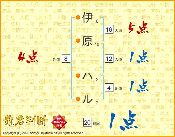 伊原ハルさんの総運は20画の1点!